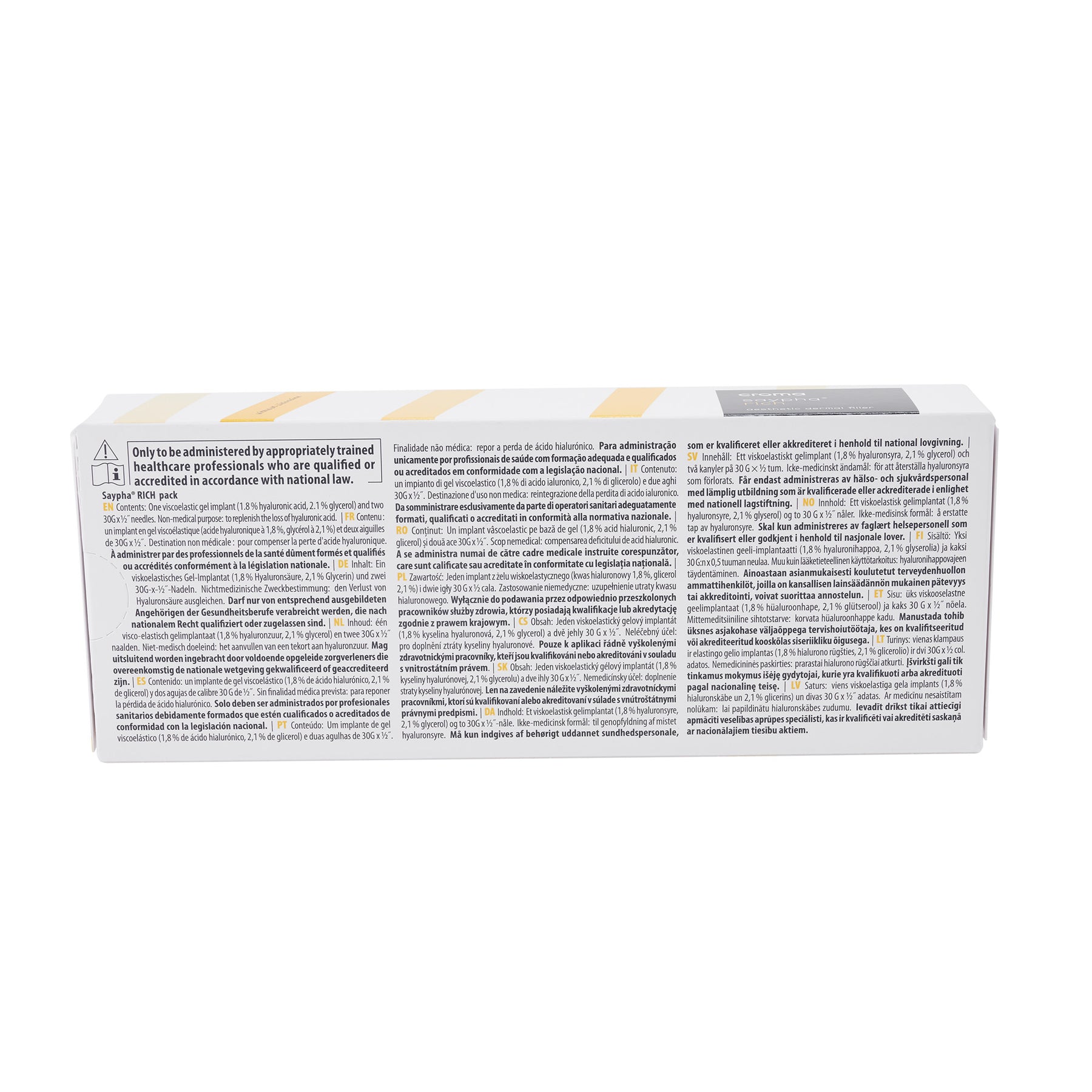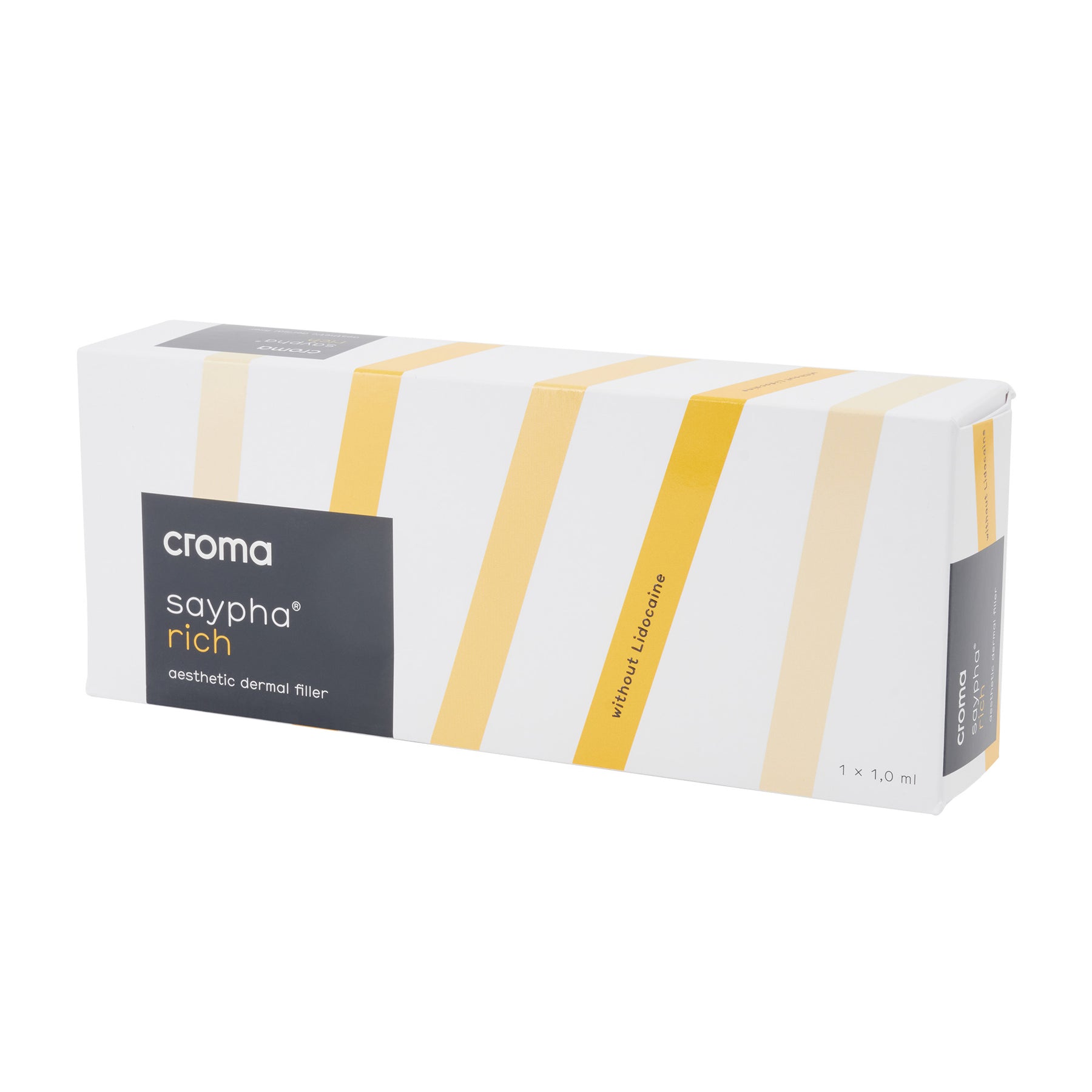 Saypha Rich von Croma Pharma wurde speziell für die ästhetische Mesotherapie entwickelt, um den alterungsbedingten Verlust von Hyaluronsäure in der Haut auszugleichen und so die Hydratation, Spannkraft und Elastizität der Haut zu verbessern. Darüber hinaus eignet es sich zur Behandlung feiner Fältchen. Ebenfalls wird durch das Produkt die Elastin- und Kollagensynthese angeregt, was einen verjüngenden und revitalisierenden Effekt auf das Gewebe haben kann. Durch die hohe HA-Konzentration sowie ein hohes Molekulargewicht (3 Mio. Dalton) wird der Feuchtigkeitsgehalt der Haut dauerhaft steigert.